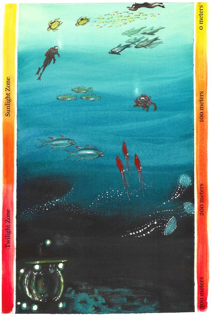 A watercolor rendering of a submersible in the darkened depths of the Mediterranean, approximately 300 meters down, surveying the sea floor. Image credit: Veronica Tremblay for The Science Writer