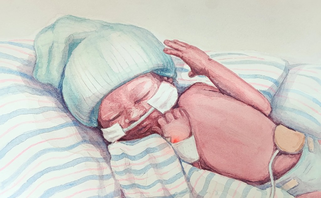 For parents, the physical separation from their baby can be one of the most distressing aspects of a NICU stay. Image credit: Watercolor by Veronica Tremblay for The Science Writer